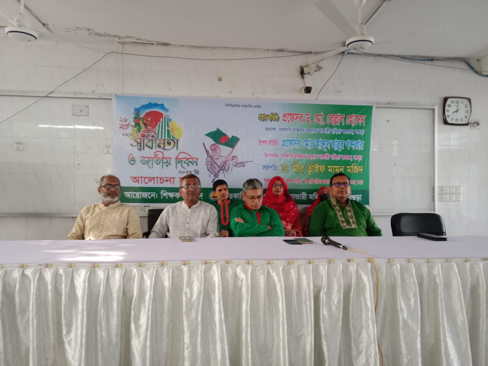 মহান স্বাধীনতা ও জাতীয় দিবস-২০২৬ যথাযোগ্য মর্যাদায় অনুষ্ঠিত হয়। উক্ত অনুষ্ঠানের প্রধান অতিথি: প্রফেসর ড. মো. বেল্লাল হোসেন, অধ্যক্ষ, সরকারি মজিবর রহমান ভান্ডারী মহিলা কলেজ,বগুড়া, বিশেষ অতিথি :প্রফেসর মো:আব্দুস ছাবুর খন্দকার, উপাধ্যক্ষ, সভাপতি : জনাব ড. মীর ত্বাইফ মামুন মজিদ, সম্পাদক, শিক্ষক পরিষদ, উক্ত অনুষ্ঠানে বক্তব্য রাখেন অধ্যক্ষ, উপাধ্যক্ষ, সম্পাদক শিক্ষক পরিষদ, জনাব মো: ফারুক হোসেন, সহযোগী অধ্যাপক ও যুগ্ন সম্পাদক শিক্ষক পরিষদ, জনাব ড. মো: আবু বক্কর সিদ্দিক, সহযোগী অধ্যাপক ও বিভাগীয় প্রধান, উদ্ভিদবিদ্যা বিভাগ, উপস্থিত ছিলেন অত্র কলেজের সকল বিভাগের বিভাগীয় প্রধান, শিক্ষক ও কর্মচারীবৃন্দ।